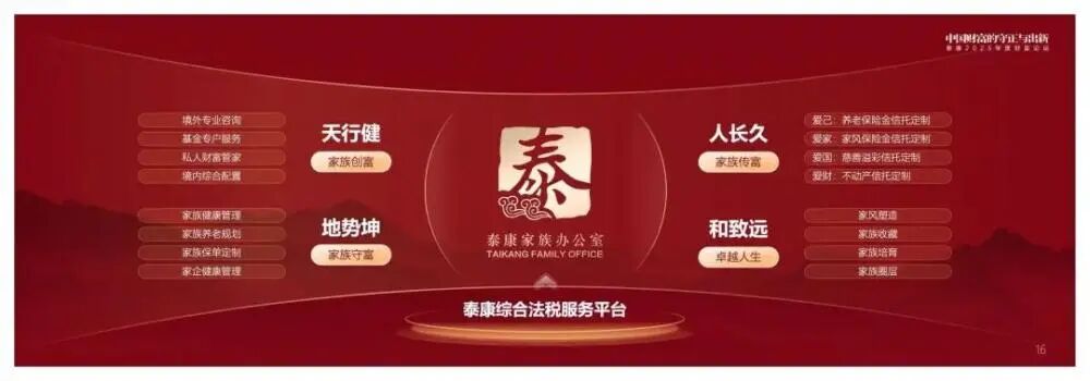 泰康家族辦公室構建了“天地人和”四大核心服務體系,以綜合法稅服務平臺加固夯實,精準覆蓋家族創富、守富、傳富全流程需求。